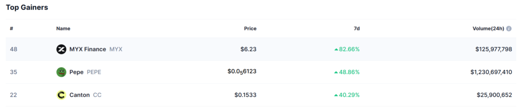 Among the numerous altcoins, MYX Finance (MYX) has emerged as the standout performer of the week, skyrocketing by an astonishing 82.66%. As of the latest update, MYX is trading at $6.23, with a robust trading volume exceeding $125 million in the past 24 hours. This surge marks a notable turnaround following a preceding period of weakness and indicates a renewed speculative interest in MYX, likely spurred by Bitcoin’s dominance and the overall positive market sentiment.