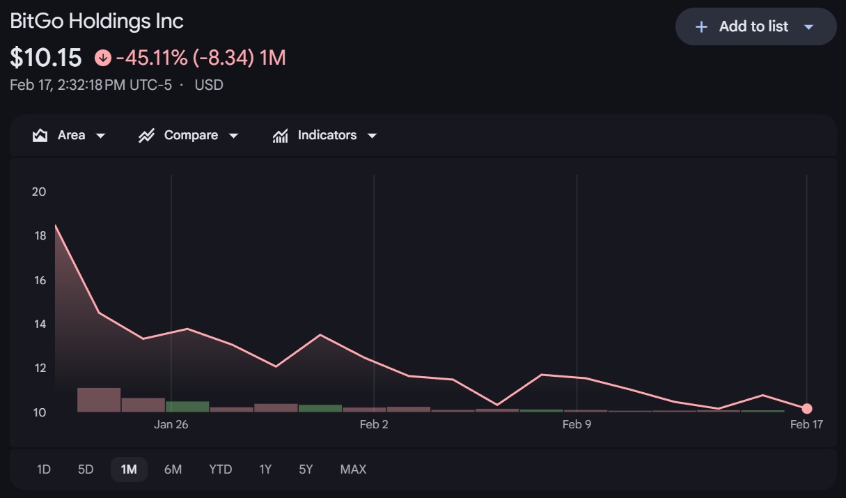 Shares of cryptocurrency custodian BitGo (BTGO) experienced a decline on Tuesday as Mizuho initiated coverage of the newly public company with an "outperform" rating, targeting a price of $17. The analysts emphasized that BitGo is poised to benefit from the increasing demand for regulated digital asset infrastructure. Currently trading around $10.15, BitGo’s stock is down approximately 44% from its $18 IPO price in January, signaling a considerable drop in enthusiasm since its debut on the New York Stock Exchange.