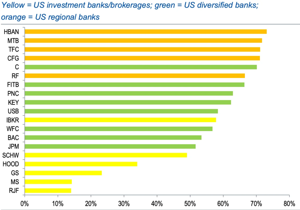 To pinpoint which banks are most at risk, Standard Chartered analyzed net interest margin (NIM) income as a percentage of total revenue. This metric offers insight into vulnerability to deposit flight, as deposits are crucial for generating net interest income. The findings indicate that U.S. regional banks exhibit the highest risk due to their heavy reliance on deposit-driven lending. In contrast, diversified banks face moderate risks, while investment banks and brokerages, which are less dependent on deposits, show the least exposure.