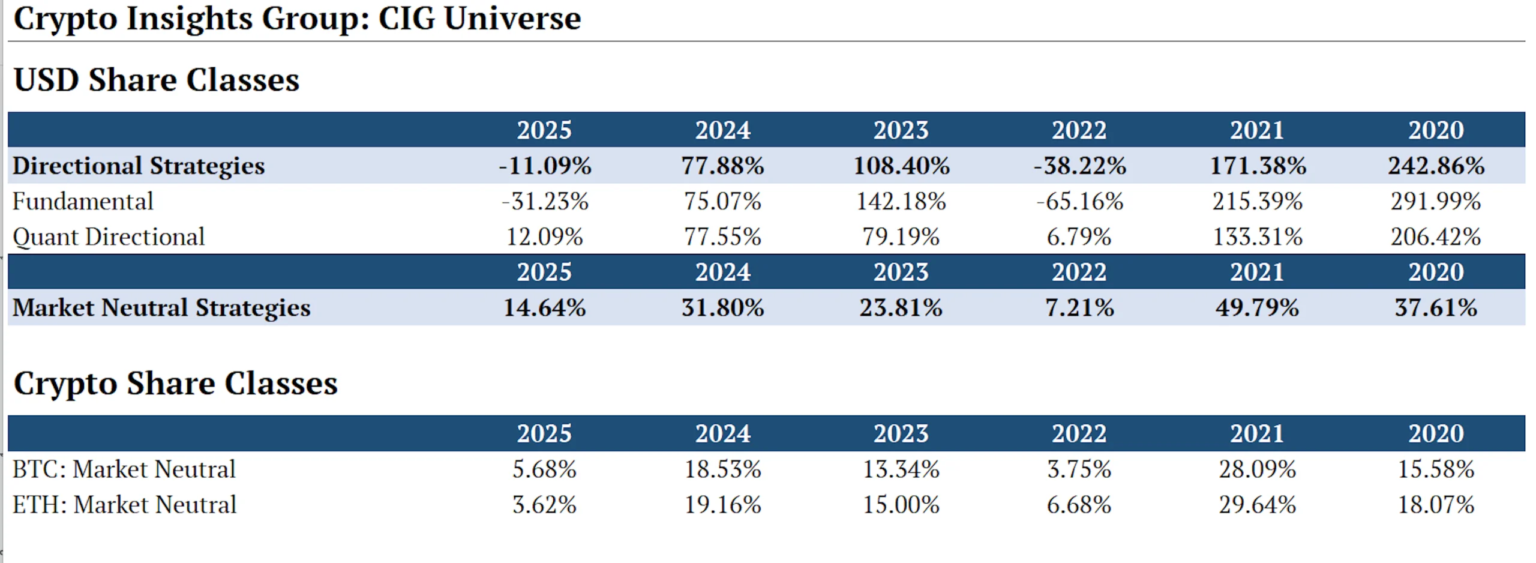 Recent data from Crypto Insights Group reveals a stark division in crypto hedge fund performance based on strategy. Directional strategies have faced challenges, with many funds seeing declines of around 11%. Notably, fundamental long/short funds have struggled significantly, with losses exceeding 31%. In contrast, market-neutral funds, which do not rely on market trends to generate profits, have reported impressive gains of about 14.6%.