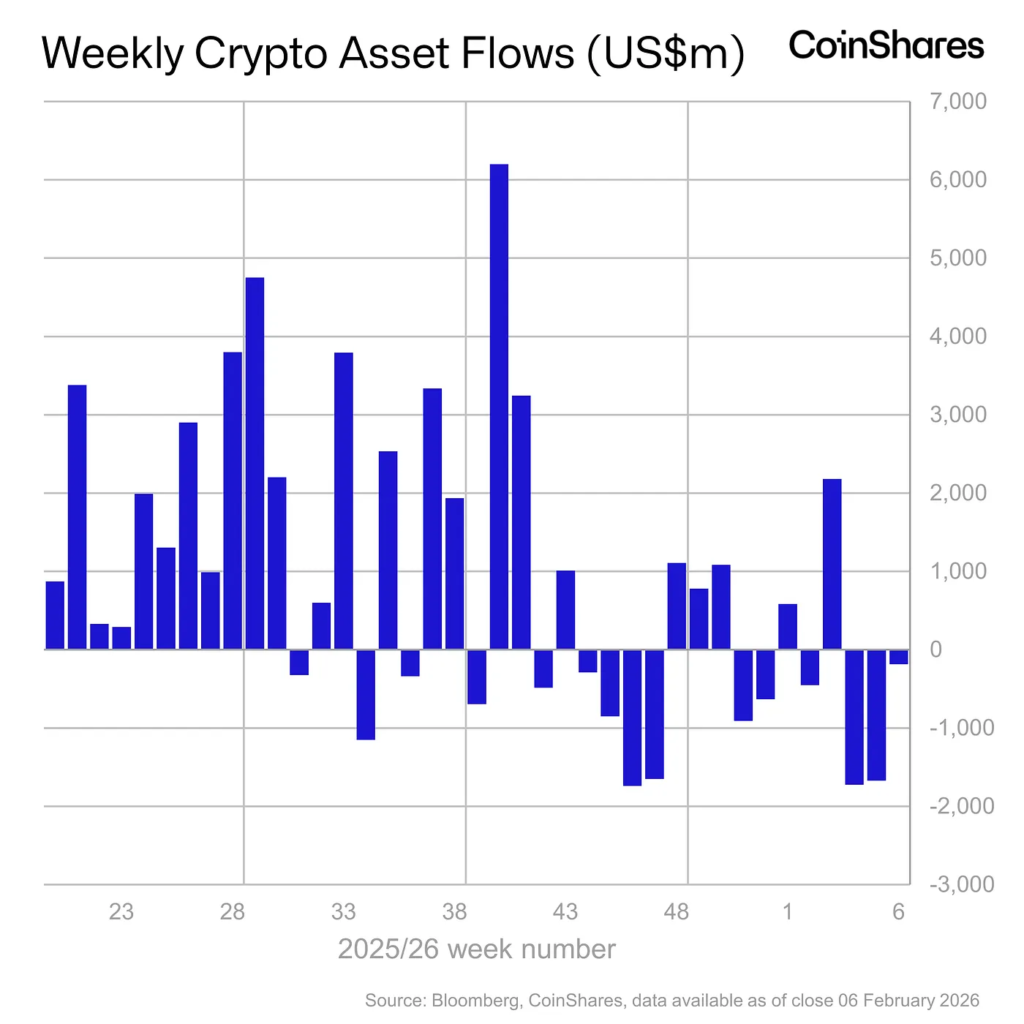 Recent data from CoinShares indicates that crypto investment products from major asset managers, including BlackRock, Fidelity, and Grayscale, are experiencing a significant slowdown in net weekly outflows. This trend is seen as an early sign of stabilization after a tumultuous period for digital asset markets. In the past week, global funds backed by cryptocurrencies reported net outflows of $187 million, a stark decrease compared to the previous two weeks, which saw approximately $1.7 billion withdrawn from the sector.