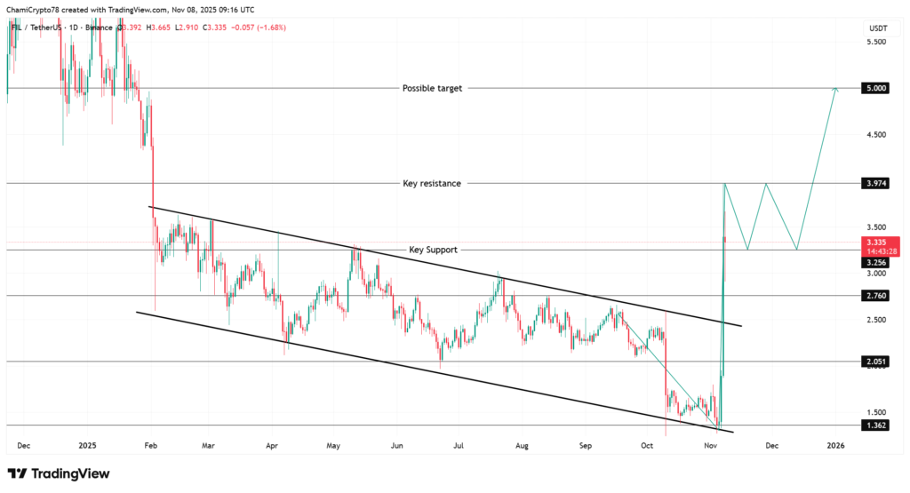 Currently trading near $3.26, Filecoin has managed to break free from a prolonged multi-month downtrend that has stifled the market since early 2025. The significant rally from $1.8 to $3.9 represents a shift in investor sentiment. This breakout comes in the wake of renewed buying interest, which has been supported by favorable technical indicators. The $3.2 level that previously acted as a resistance has transformed into a strong support zone, providing a new foundation for future price movements. The immediate focus now shifts to the $3.9 mark, which presents a critical barrier that bullish traders are determined to overcome.